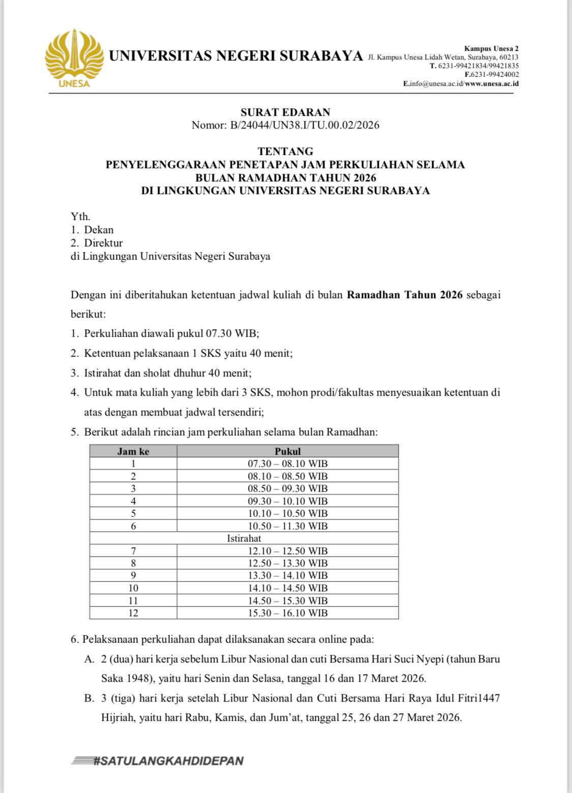 Surabaya State University (Unesa) has issued Circular Letter Number B/24044/UN38.I/TU.00.02/2026 concerning the Implementation of Determining Lecture Hours during the Month of Ramadhan 2